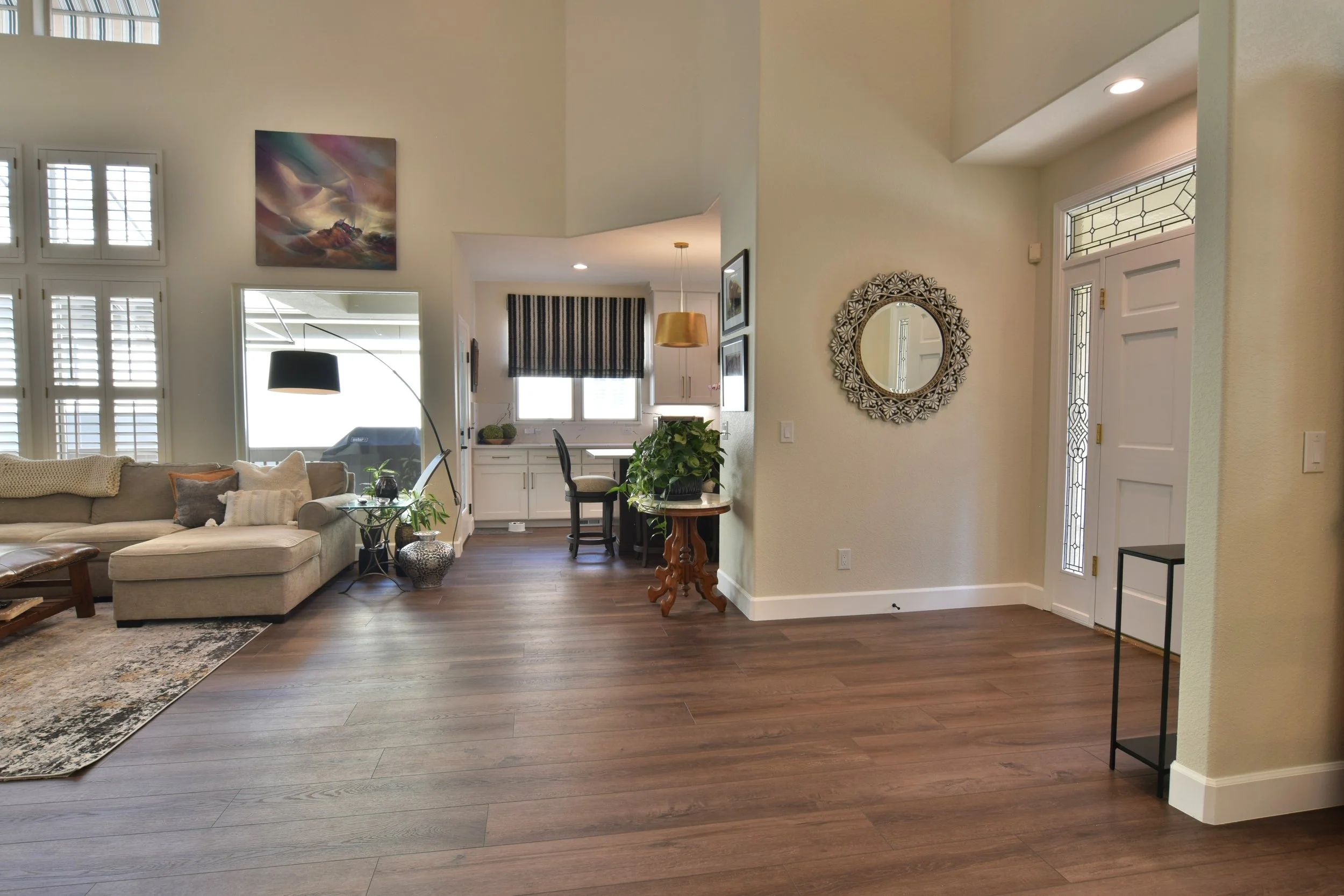 In the entryway, we took out a large load bearing wing-wall that closed off the kitchen to one doorway. With any walls being removed, we often need to bring in an engineer to ensure all plans are signed off on and will not compromise the home’s structural integrity. Once cleared by the engineer, an LVL beam was extended and squash blocks were installed allowing the support beams in the subfloor to remain strong. These beams were placed into the basement ceiling. This change allowed for a true main level open concept! Now you can walk in and see every room from the entryway.