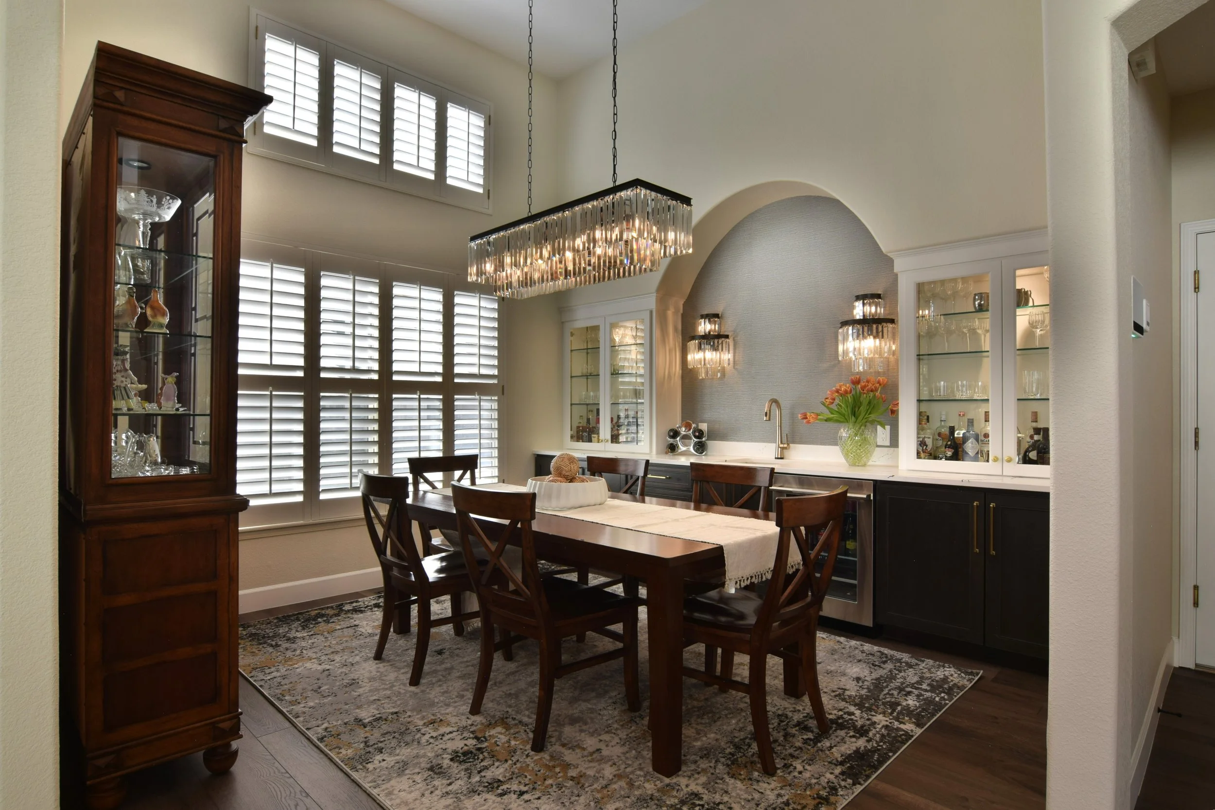 Another challenge we encountered in this home remodel was in the dining room, which featured a gorgeous wine & coffee bar addition, also known as a wet bar. And if you’re someone who loves to entertain, a wet bar is essential when creating The Perfect Entertainer’s Kitchen! This new wet bar included a new wine refrigerator. When the fridge arrived, we discovered the appliance dimensions were larger than the specifications provided by the manufacturer. And so, the space below the countertop was too small for the new fridge. In true Maverick fashion, our team put their heads together and provided a solution that did not impact the overall design aesthetic and appearance of the new wet bar.