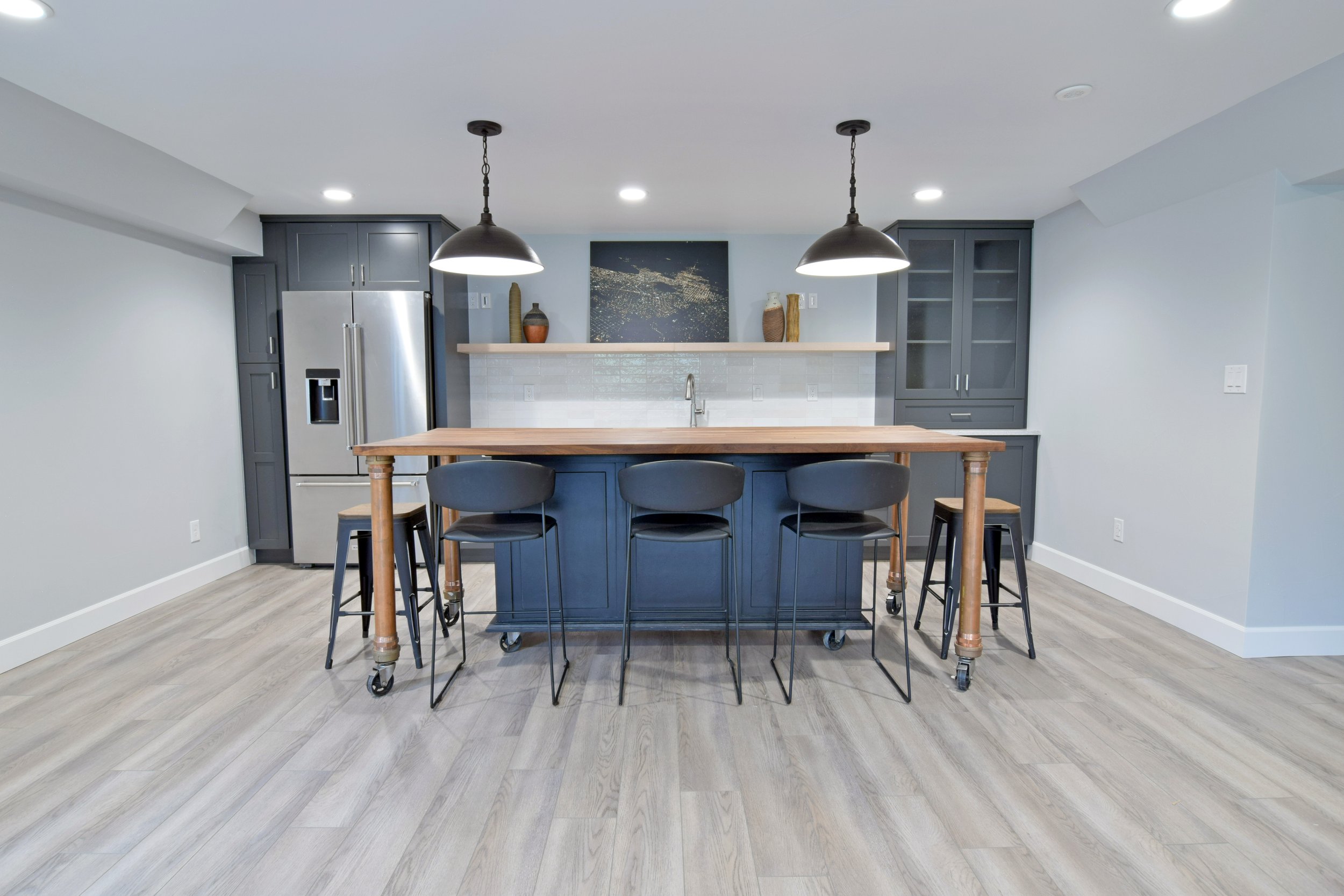 One standout example came in the basement. A cabinet to the left of the refrigerator was originally meant to be a framed wall. Because the space wasn’t seen by Maverick prior to the insurance company performing mitigation, our team was unaware of the original wall. Once our client informed us of the original wall that was now missing, and rather than backtrack extending our time and materials, Maverick adjusted on the fly and instead recommended a cabinet install. This cabinet offered more storage, function and aesthetics. Our client was thrilled and moved forward with the cabinet.